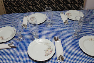 Para combinar com as plaquinhas de identificação utilizei na mesa uma toalha xadrez com azul, copos para cerveja e refrigerantes ( agora não coloco em outro recipiente - sugiro aos convidados que sirvam-se no frigobar- facilitou muito, pois quando colocava em recipientes com gelo sempre acabava molhando o móvel por mais cuidadosa que fosse).